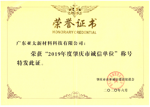诚信之誉,立足之基 广东亚太公司荣获“2019年度肇庆市诚信单位”称号阅读次数:910 | 发布日期:2020/6/19 | 作者: | 来源: