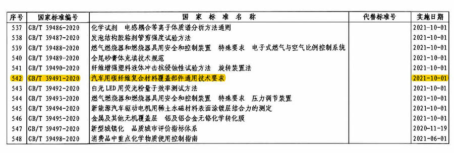 近日,米乐牵头主导制定的国家标准GB/T39491-2020《汽车用碳纤维复合材料覆盖部件通用技术要求》由国家市场监督管理总局批准发布,标准将于2021年10月1日开始实施。