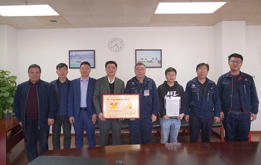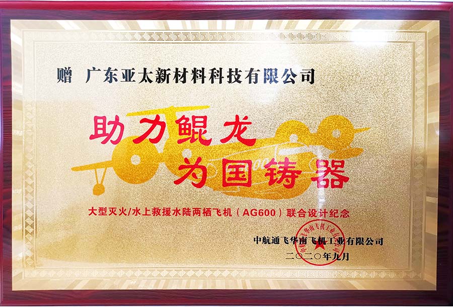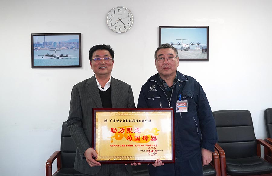 广东亚太新材料科技公司董事长朱增余非常高兴的接过董事长熊贤鹏授与的牌匾,由衷的表示:能为中国的航空事业做贡献,是广东亚太公司的荣幸,感到非常的自豪;获得“助力鲲龙 为国铸器”殊荣,是对亚太公司研发团队实力的肯定和鼓励,也感谢通飞公司给予我们团队学习和积累经验的机会,希望以后有更多机会深入合作,为我国航空产业的发展做出更多贡献。