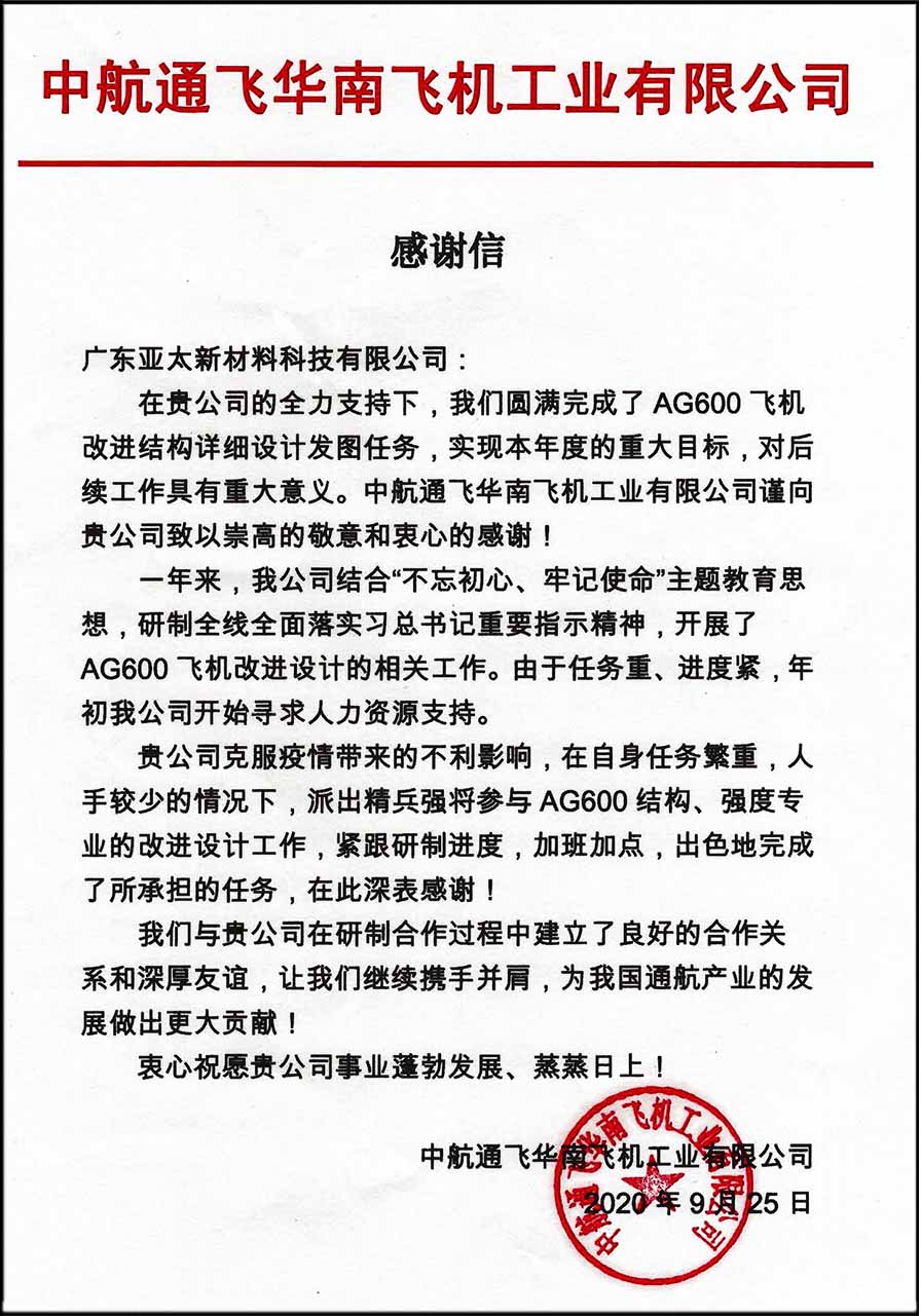 中航通飞华南飞机工业公司是专业从事通用飞机和特种飞机研制生产的飞机主制造商。中航通飞研究院有限公司总设计研发的AG600型水陆两栖飞机,是国家重点支持开发项目,4月6日,广东亚太公司与中航通飞研究院有限公司就AG600飞机研发改进项目合作正式启动,亚太公司先后派出55位科研人员参与该项目的设计与研发,全力以赴完成了担负的各项任务。7月26日,AG600型水陆两栖飞机在山东青岛海上试飞成功。9月25日,中航通飞华南飞机工业公司给广东亚太公司送来感谢信,信中表示“贵公司克服疫情带来的不利影响,在自身任务繁重,人手较少的情况下,派出精兵强将参与AG600结构、强度专业的改进设计作业,紧跟研制进度,加班加点,出色地完成了所承担的任务,在此深表感谢!”