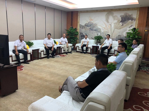 图:张浩龙常委、副市长(前排中间)在朱增余董事长(右一)、罗国伟副总(左一)